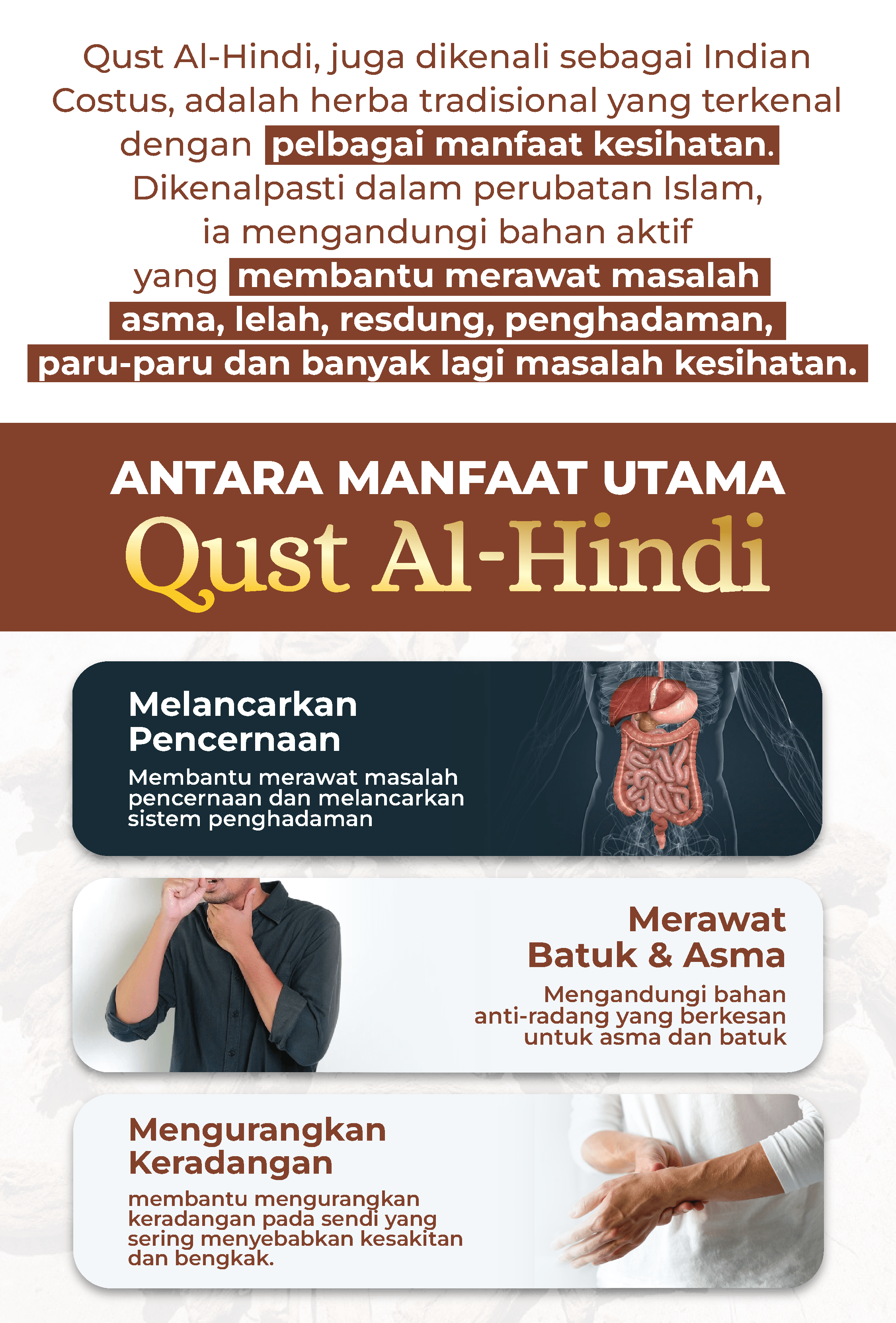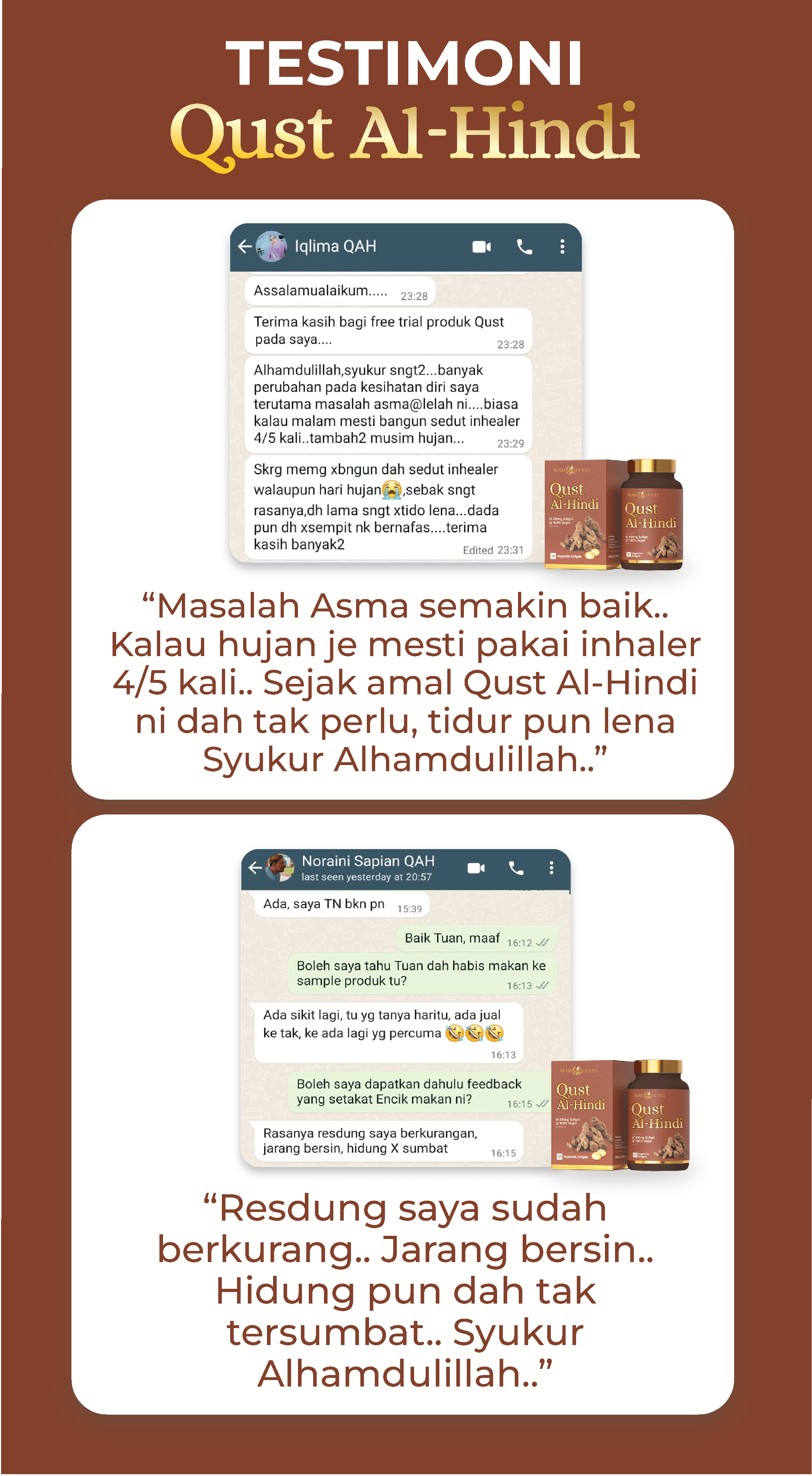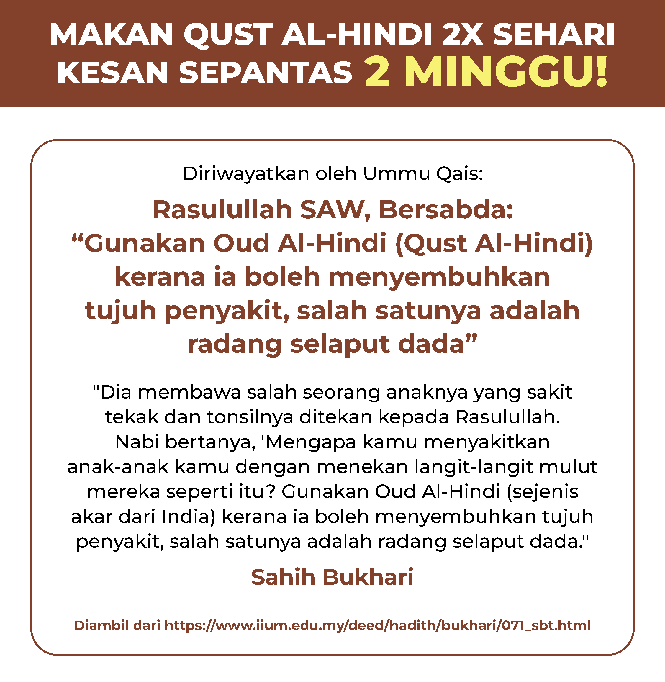 Ambil 2 biji Qust Al Hindi setiap hari, selepas makan. 1 biji pagi dan 1 biji petang. Untuk hasil terbaik, amalkan secara konsisten